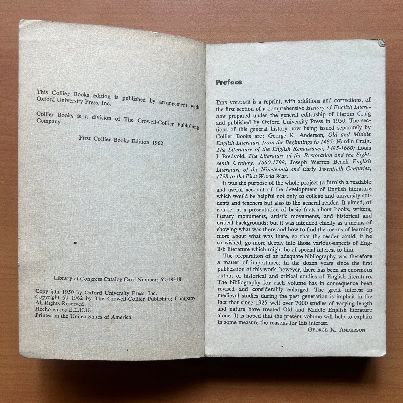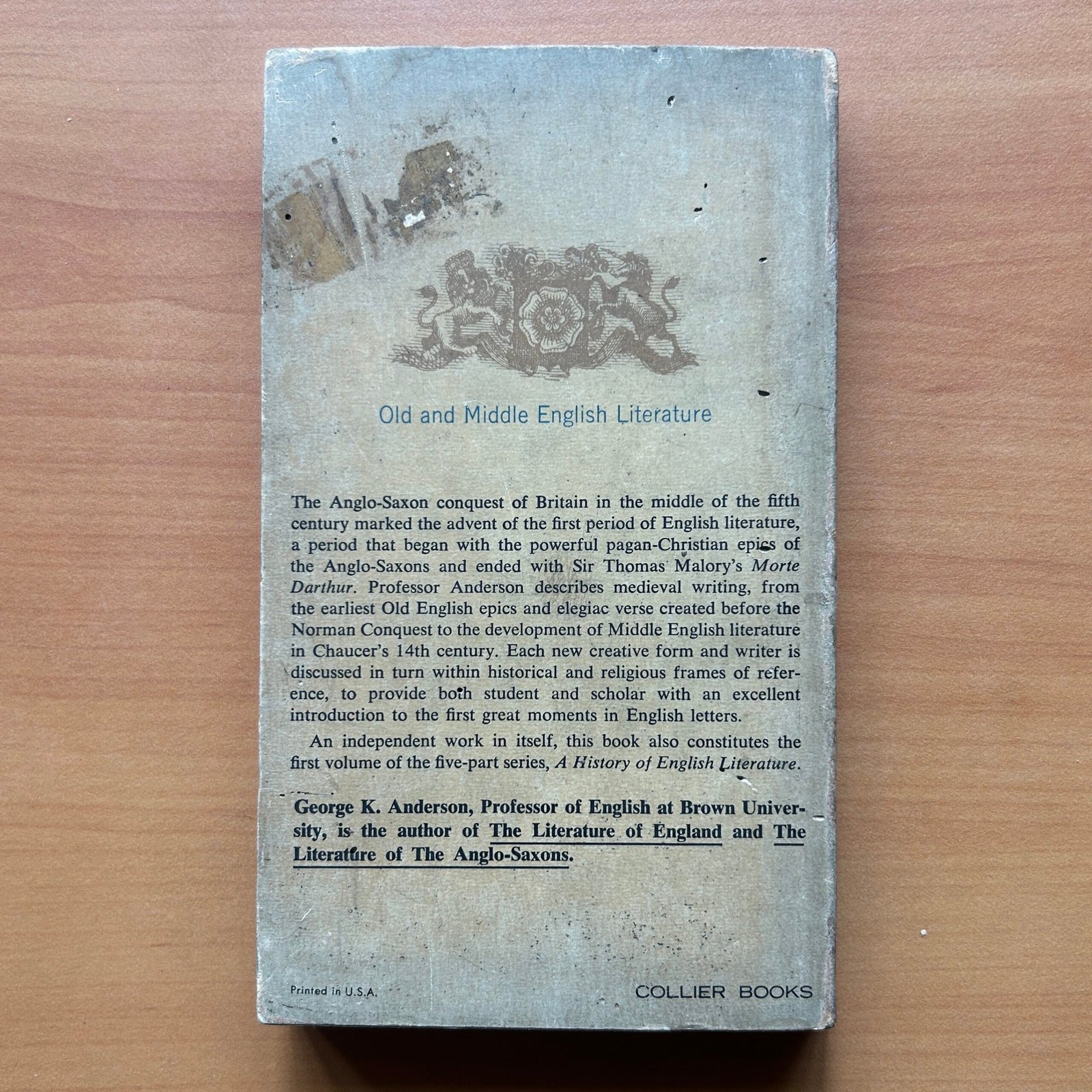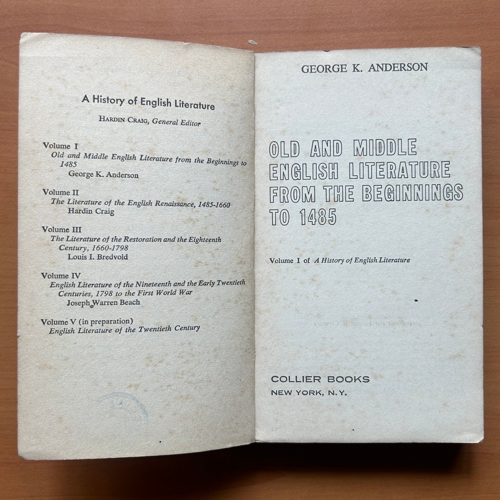 Old and Middle English Literature: From the Beginnings to 1485 by George K. Anderson is a foundational scholarly work that explores the origins and development of English literature from its earliest beginnings through the late medieval period. This 1962 first edition paperback by Collier Books (302 pages, compact 4.5 × 7 inches) combines academic depth with collectible value.